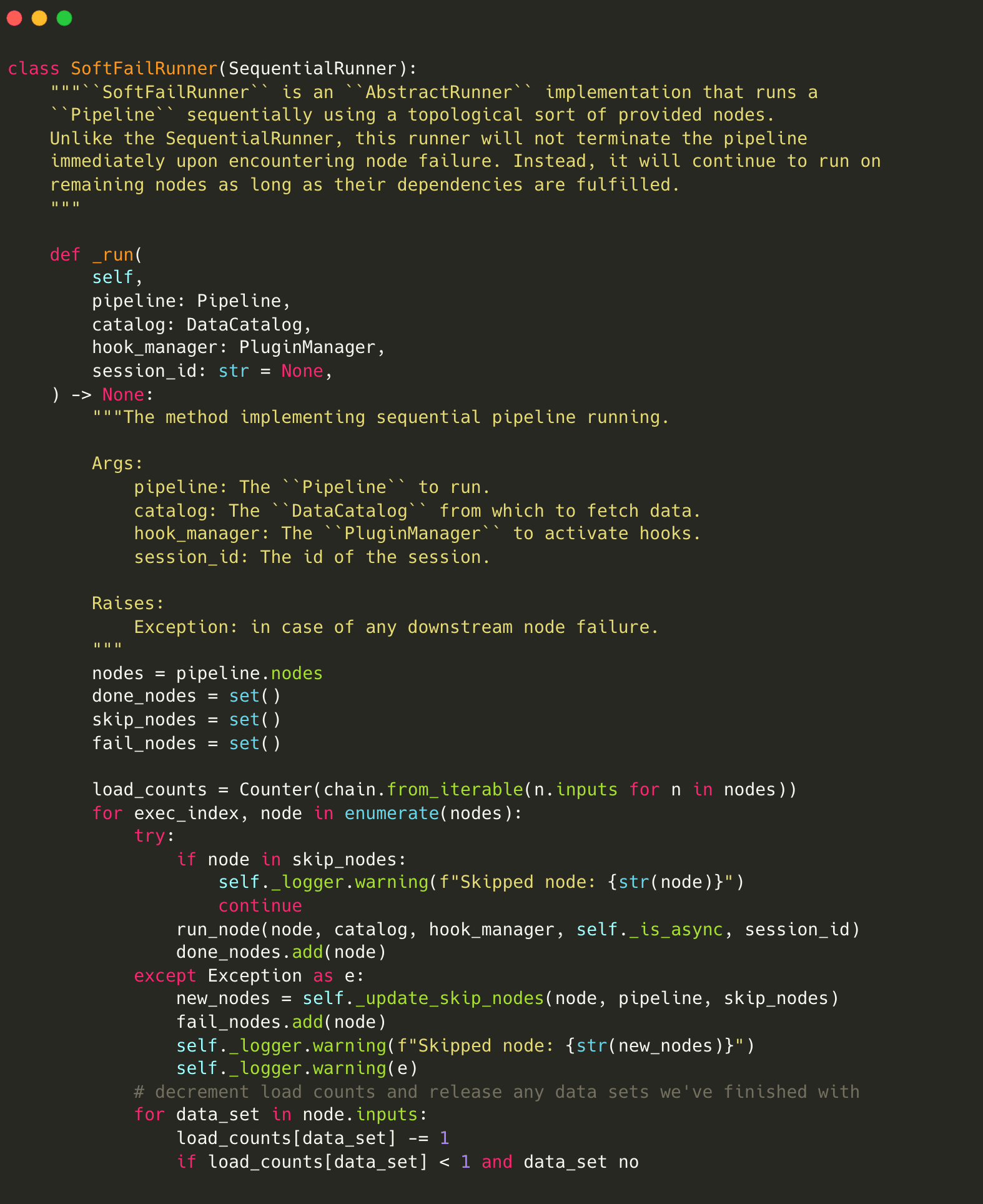 is an implementation of AbstractRunner that runs a pipeline sequentially using a topological sort of provided nodes. Unlike the built-in SequentialRunner, this runner does not terminate the pipeline but runs any remaining nodes as long as their dependencies are fulfilled. The SoftFailRunner
