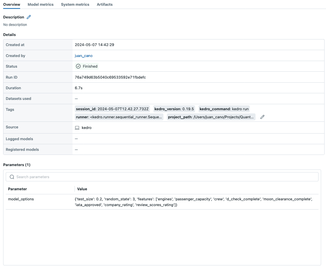 And that’s it! Once installed, a hook will automatically register, ensuring that every `kedro run` is logged to MLflow without any additional configuration.